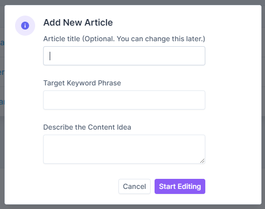 Enter a title or a placeholder such as "asdf" (or whatever you want). Topyc will create its own optimized article title later. Enter a target keyword and describe the content idea briefly (one sentence is good). Then click "Start Editing".