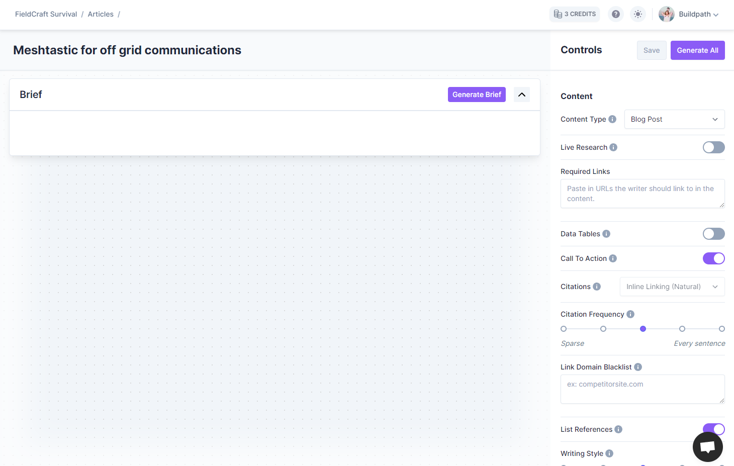 Now you'll be brought to the article editor. Here you can customize your article settings on the right sidebar, or leave them on their defaults. Then click "Generate All" and Topyc will generate the article brief, content outline and full article for you.